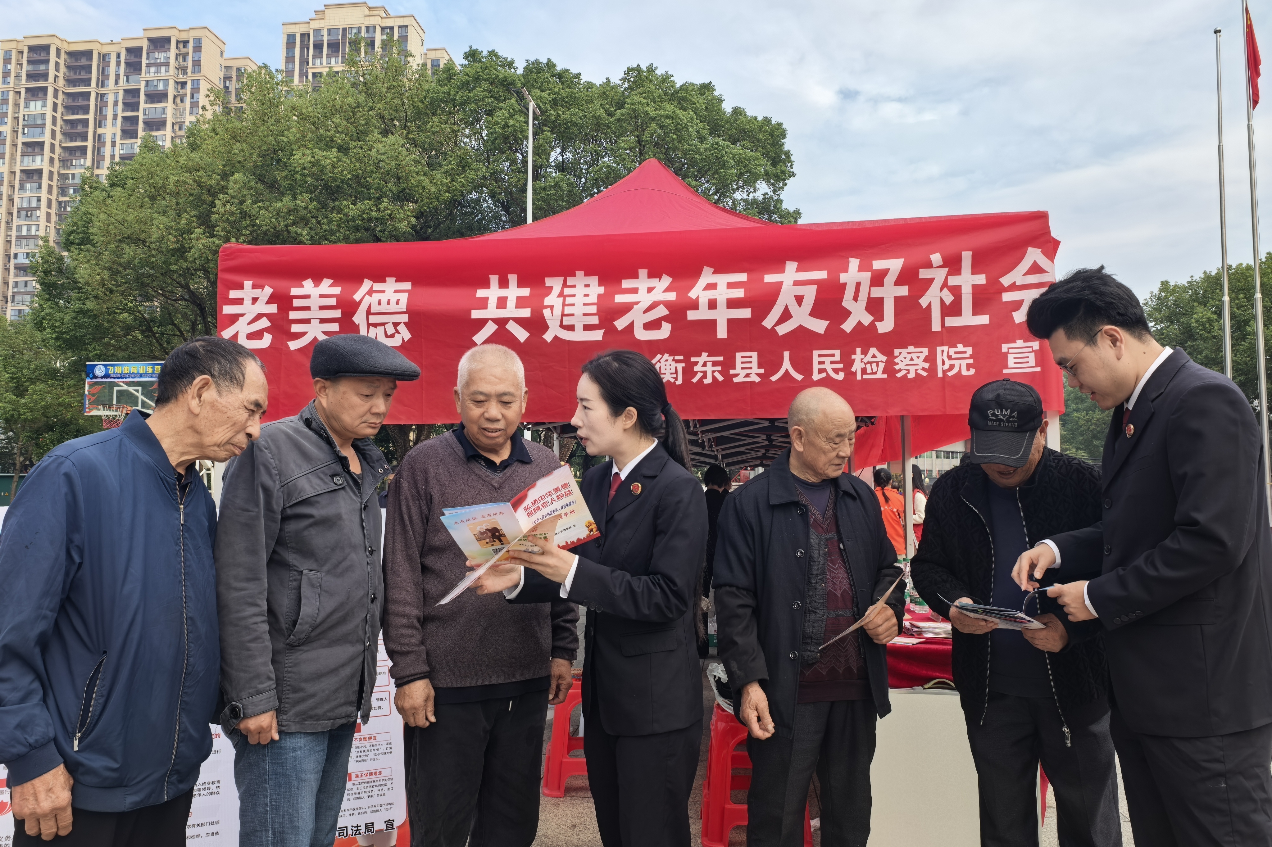 丹桂飘香,又逢重阳佳节。为大力弘扬中华民族尊老、敬老、爱老、助老的传统美德,切实维护老年人合法权益,重阳节当天上午,衡东县检察院联合县民政局在县文化体育广场开展“弘扬孝亲敬老美德,共建老年友好社会”主题普法活动,为老年人送上了一份实用的“法治礼包”。