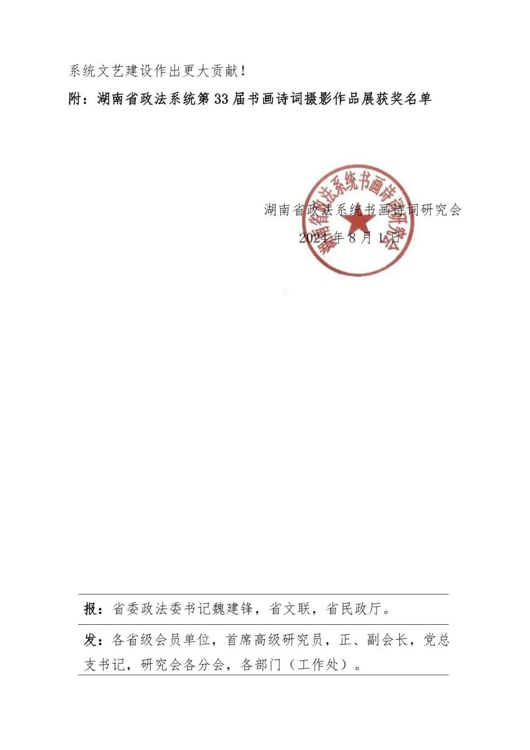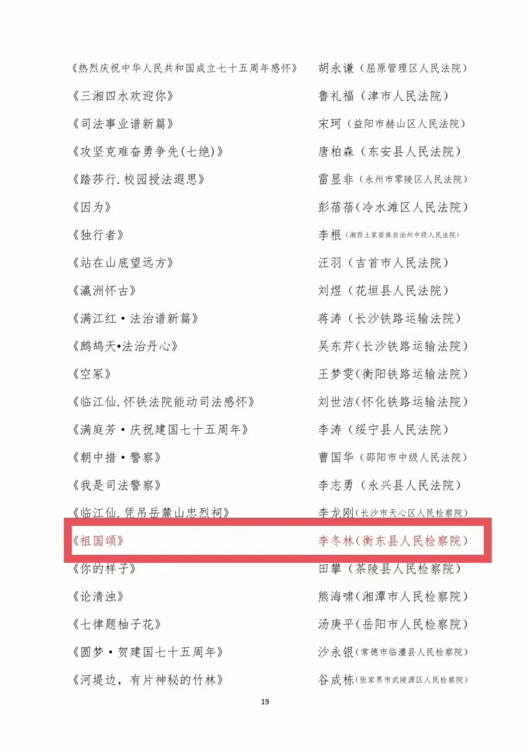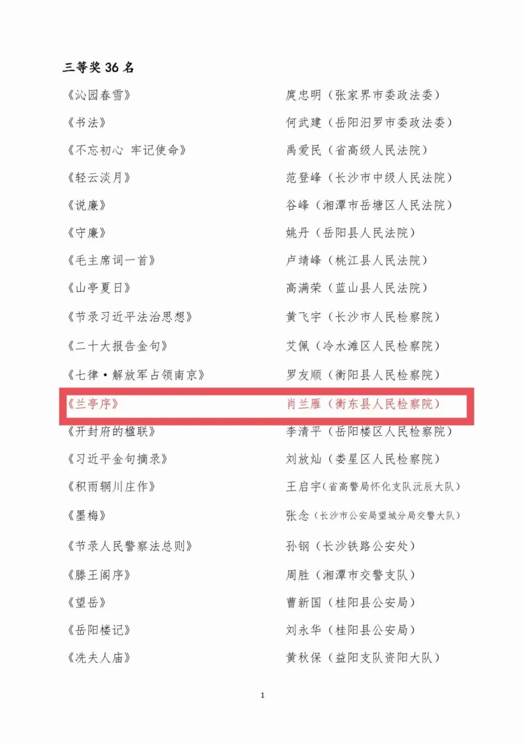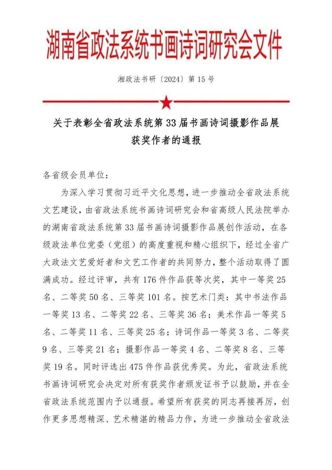 近日,在湖南省政法系统书画诗词研究会和省高级人民法院举办的湖南省政法系统第33届书画诗词摄影作品展创作活动中,我院有2件作品获奖,其中党组成员、政治部主任肖兰雁的书法作品《兰亭序》荣获三等奖,退休干警李冬林的诗词作品《祖国颂》荣获优秀奖!
